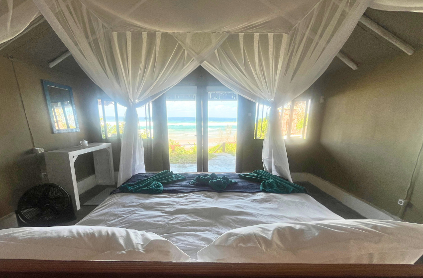 Escape to a unique coastal retreat where the bush meets the beach at Baleia Azul Tent No. 8, located within the tranquil Baleia Azul Estate in Ponta Mamoli. Surrounded by natural vegetation and overlooking the ocean, this luxury safari-style tent offers a peaceful setting for guests looking to unwind while staying close to nature. Accommodation The tent is designed to provide both comfort and simplicity in a natural setting. At its centre is a king-size xtra length bed with mosquito net, ensuring a restful night’s sleep. The tent also includes a single sleeper couch with a mosquito net, suitable for an additional guest or child. There is ample space for a blow-up mattress, should guests wish to bring one (bedding not provided). The en-suite bathroom features a shower, double vanity basins, and a toilet connected to a septic tank system. Outdoor Living A spacious wooden deck extends from the tent, offering a relaxing space to enjoy the surrounding views. Guests can cool off in the private splash pool or enjoy meals at the four-seater outdoor dining table. Kitchen Facilities The outdoor kitchen, located just outside the tent, is equipped for easy self-catering and includes a double gas burner and braai, along with crockery, cutlery, pots, pans, and cooking utensils. An outdoor shower is also available, ideal for rinsing off after time spent at the beach. Comfort & Connectivity To ensure a comfortable stay, the tent is equipped with air conditioning and a fan. While the setting offers a quiet escape from everyday life, guests can purchase a local SIM card for mobile reception if they wish to stay connected. Activities & Surroundings Just a short distance from the tent lies Frederico’s Reef, a popular spot for swimming and snorkeling. At low tide, the reef reveals vibrant marine life and calm tidal pools, making it an ideal place to explore the ocean. Baleia Azul Tent No. 8 offers a relaxed and memorable way to experience the beauty of Mozambique’s coastline — perfect for couples or small families looking for a peaceful seaside escape surrounded by nature.