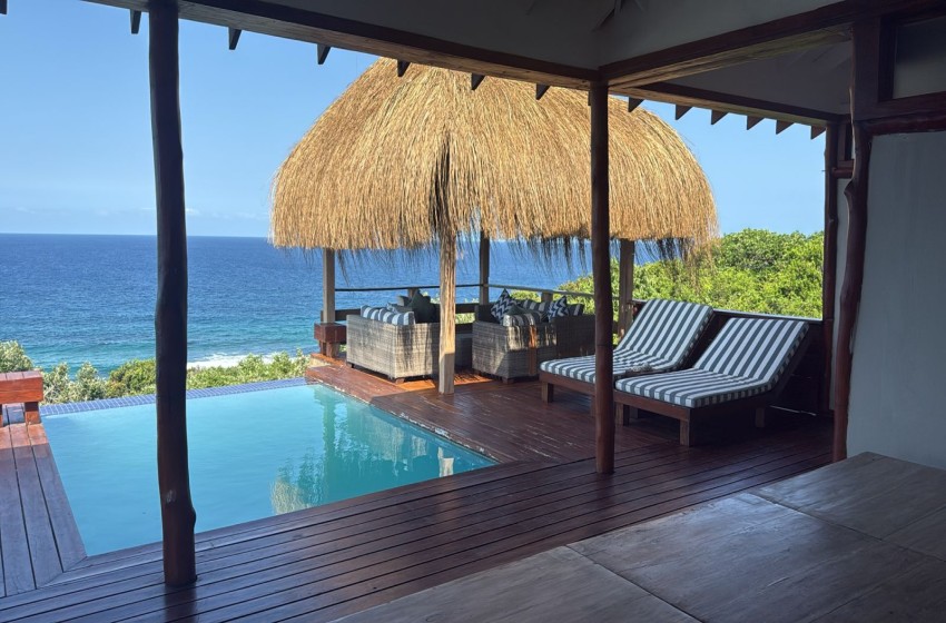 This holiday home is situated on a well-managed housing estate in Ponta Mamoli. Situated on Fredericos Bay snorkeling spot. The beautiful beach house consists of the following: This home has 4 en-suite air-conditioned bedrooms: Bedroom 1 - sea-facing with 1 extra-length king-size bed sleeping 2 adults plus a loft with a queen-size mattress that sleeps 2 children under 12. (en-suite bathroom with shower and bath) and opens onto the swimming pool deck. Bedroom 2 - Inland facing, 2 single extra length beds, ensuite bathroom with shower, toilet, hand basin (beds can be pushed together) Bedroom 3 - is a loft with 2 single beds. Has a bath, toilet, and hand basin Bedroom 4 - sea facing with 2 single extra length beds (en-suite bathroom with a shower toilet, and hand basin) sleeping 2 adults. has a mattress converter to change the bed to a King size There is a guest bathroom downstairs. The open-plan kitchen is fully equipped for self-catering, it has an upright fridge freezer combo, toaster, kettle, microwave, Expresso Delta coffee machine, (take your own pods), and gas oven/hob. No washing machine, however, you can ask the staff to hand wash clothing, etc. The lounge area has panoramic sea views. The lounge has a TV no DSTV, however you can stream using the WIFI. There is a shelf with books to utilize should the weather not be great. The living area opens up with sliding doors onto a wooden deck with a sunken swimming pool, overlooking the ocean. The house also boasts a newly built hot tub. PLEASE NOTE: THIS IS A WOODEN HOUSE. Fire is extremely dangerous and must never be made in an uncontrolled manner. There is an outside shower to rinse off after a day on the beach. There is a braai area that has a built-in charcoal/wood braai. Ensure you bring snorkeling equipment along. Enjoy your stay!
