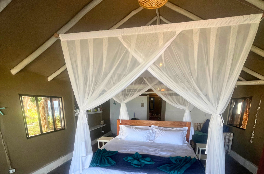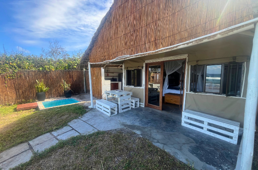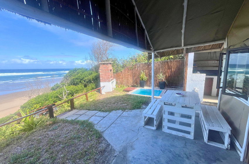 Escape to a unique coastal retreat where the bush meets the beach at Baleia Azul Tent No. 8, located within the tranquil Baleia Azul Estate in Ponta Mamoli. Surrounded by natural vegetation and overlooking the ocean, this luxury safari-style tent offers a peaceful setting for guests looking to unwind while staying close to nature. Accommodation The tent is designed to provide both comfort and simplicity in a natural setting. At its centre is a king-size xtra length bed with mosquito net, ensuring a restful night’s sleep. The tent also includes a single sleeper couch with a mosquito net, suitable for an additional guest or child. There is ample space for a blow-up mattress, should guests wish to bring one (bedding not provided). The en-suite bathroom features a shower, double vanity basins, and a toilet connected to a septic tank system. Outdoor Living A spacious wooden deck extends from the tent, offering a relaxing space to enjoy the surrounding views. Guests can cool off in the private splash pool or enjoy meals at the four-seater outdoor dining table. Kitchen Facilities The outdoor kitchen, located just outside the tent, is equipped for easy self-catering and includes a double gas burner and braai, along with crockery, cutlery, pots, pans, and cooking utensils. An outdoor shower is also available, ideal for rinsing off after time spent at the beach. Comfort & Connectivity To ensure a comfortable stay, the tent is equipped with air conditioning and a fan. While the setting offers a quiet escape from everyday life, guests can purchase a local SIM card for mobile reception if they wish to stay connected. Activities & Surroundings Just a short distance from the tent lies Frederico’s Reef, a popular spot for swimming and snorkeling. At low tide, the reef reveals vibrant marine life and calm tidal pools, making it an ideal place to explore the ocean. Baleia Azul Tent No. 8 offers a relaxed and memorable way to experience the beauty of Mozambique’s coastline — perfect for couples or small families looking for a peaceful seaside escape surrounded by nature.
